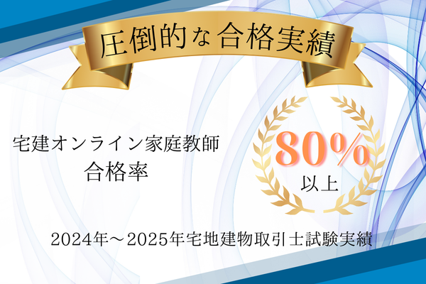宅建試験の全国平均合格率は約15%前後ですが、宅建オンライン家庭教師では、2024年(令和6年)、2025年(令和7年)の2年連続で合格率80%超を達成しています。今の点数・残り期間から状況を整理し、合格に直結する内容だけに集中することで、最短ルートでの合格を実現しています。