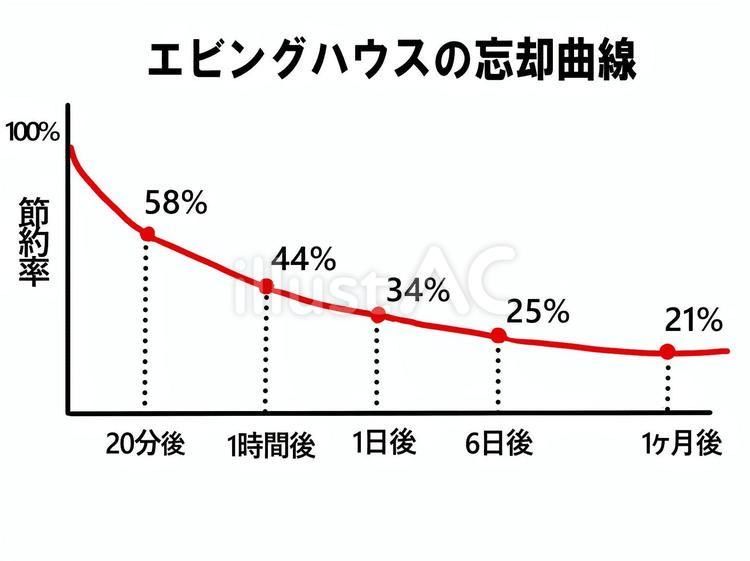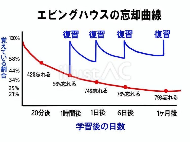 エビングハウスの忘却曲線とは、ドイツの心理学者ヘルマン・エビングハウスが提唱した、時間経過とともに記憶がどれだけ急速に失われるかを示すグラフです。曲線は学習直後から急激に記憶が減少し、その後はゆるやかになるという特徴があり、学習効果を高めるには、この忘却曲線に沿って適切なタイミングで復習を繰り返すことが重要であると示しています。復習を重ねることで、記憶の定着率が向上し、再学習にかかる時間も短縮されます。 (chat GPTより引用)